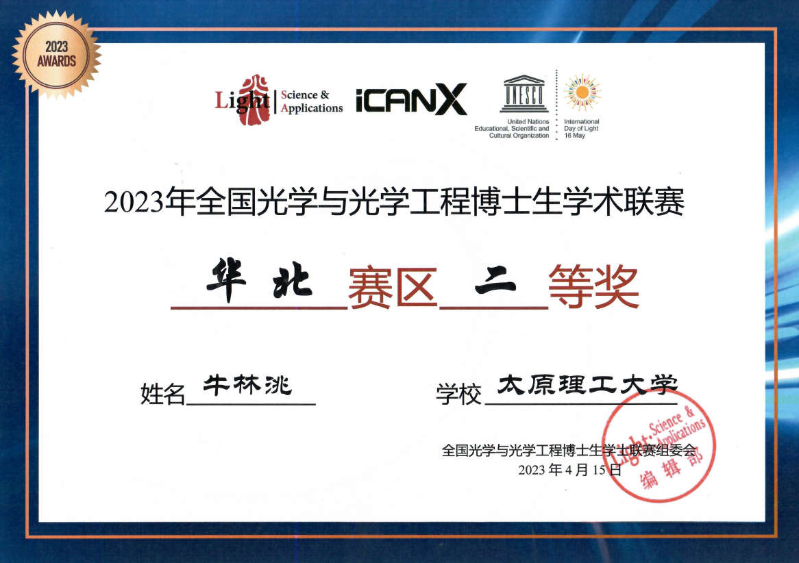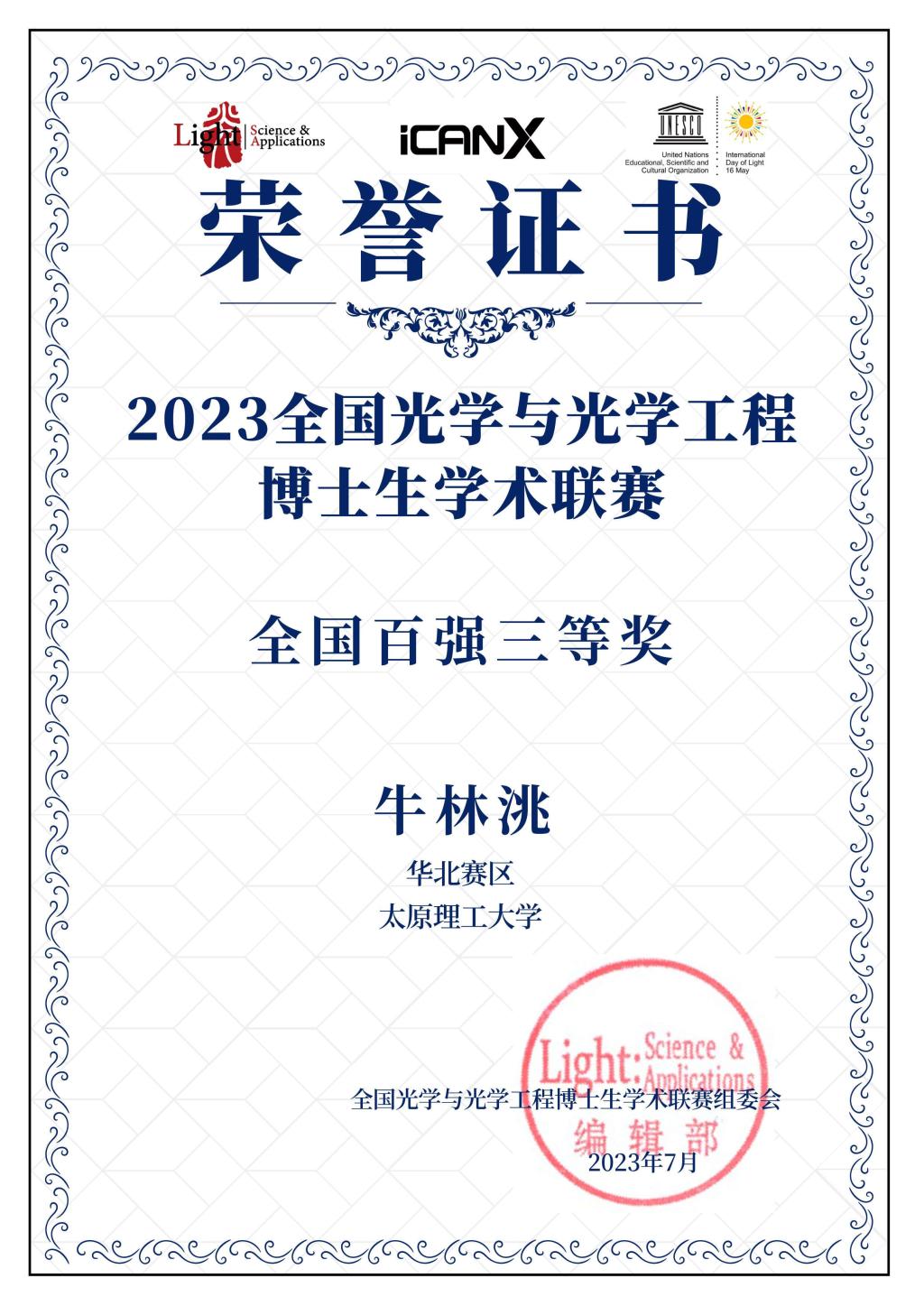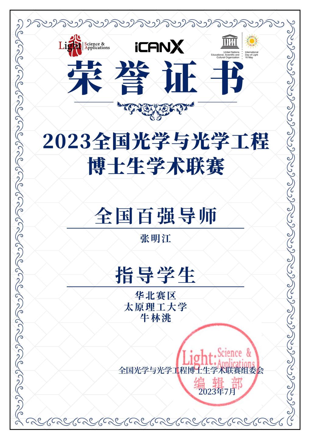 2023716日,bat365张明江教授指导的博士生牛林洮在2023年全国光学与光学工程博士生学术联赛获全国百强三等奖,张明江教授获全国百强优秀导师称号。