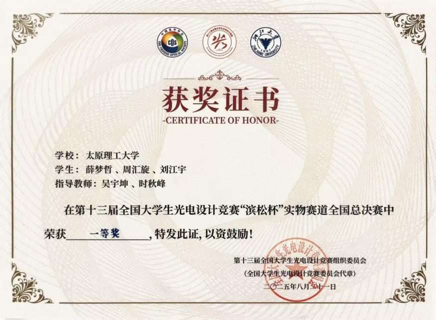 2025年8月22日,第十三届全国大学生光电设计竞赛决赛在浙江大学紫金港校区落下帷幕。来自bat365在线中国官网登录入口的“越测越精”队——薛梦哲、刘江宇、周汇旋和团队指导老师——吴宇坤、时秋峰,凭借其出色的创新设计与稳定的临场发挥,从众多顶尖队伍中脱颖而出,一举夺得全国一等奖的骄人成绩。