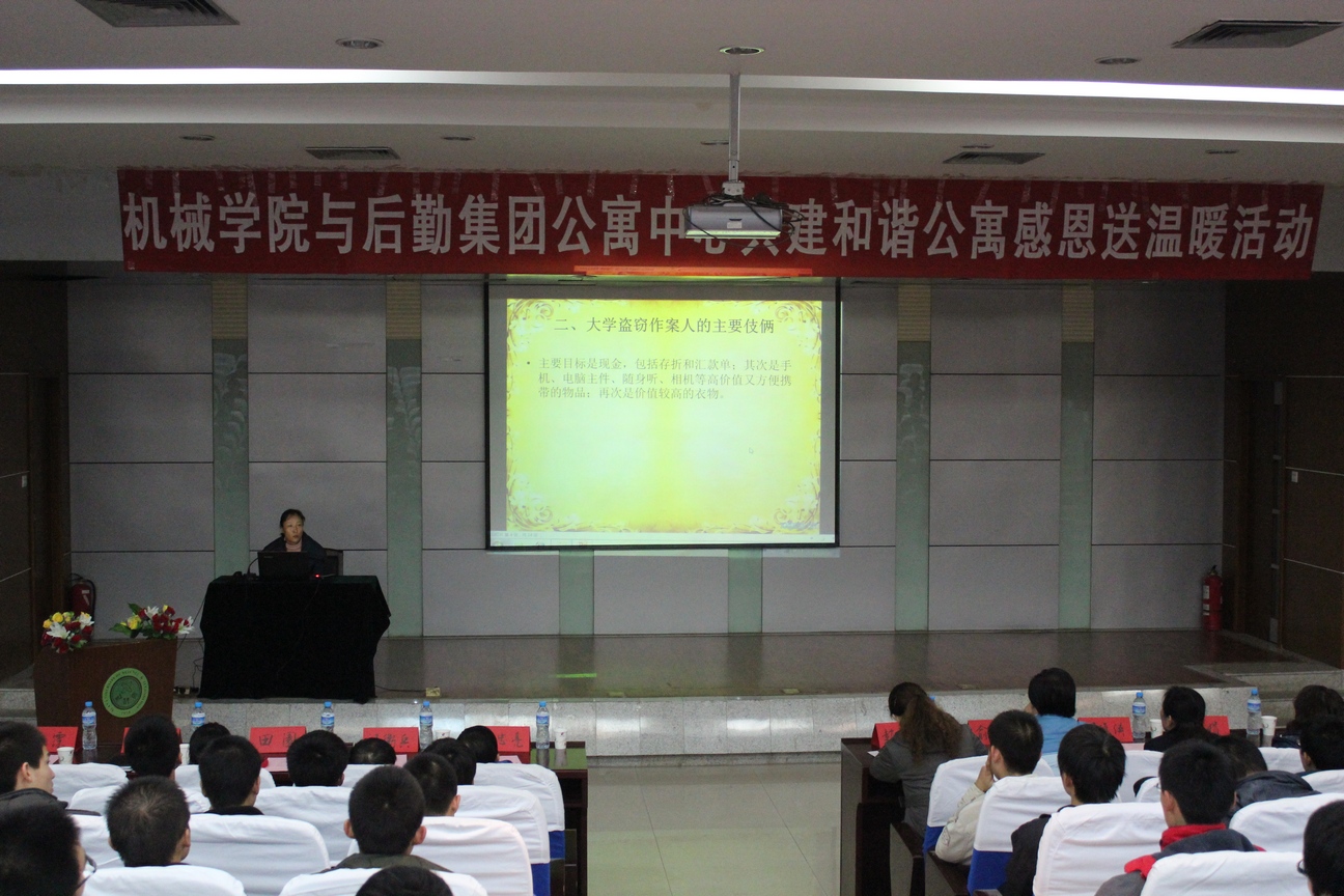 活动中,丁里主任做了题目为《大学生宿舍安全》的报告,围绕防盗、防火等内容展开了详细的讲解,通过案例分析,指出了维护宿舍安全的几条措施。接着,汪副书记与田园主任为宿舍管理员代表赠送了jdb电子受助贫困生的爱心纪念品。石处长代表后勤集团发言,他强调了宿舍安全的重要性,希望学生能够共同维持好自己的宿舍,重视宿舍安全。