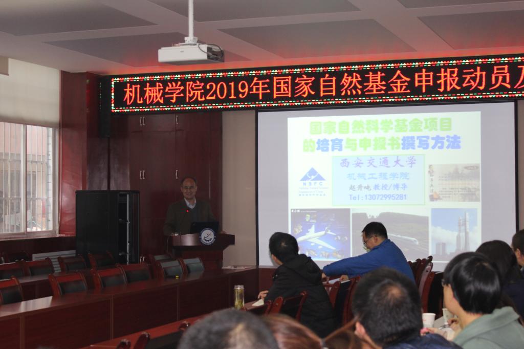 为提升学院国家自然科学基金的申请质量,有序推进2019年度基金申请工作,11月9日下午,jdb电子游戏官方网站召开2019年国家自然科学基金申报动员会,并特邀国务院政府特殊津贴获得者、西安交通大学博士生导师、全国首届优秀百篇博士论文获得者赵升吨教授来校做了题为《国家基金项目培育与申报书撰写技巧》辅导讲座。80余名师生聆听了讲座,会议由副院长寇发荣主持。