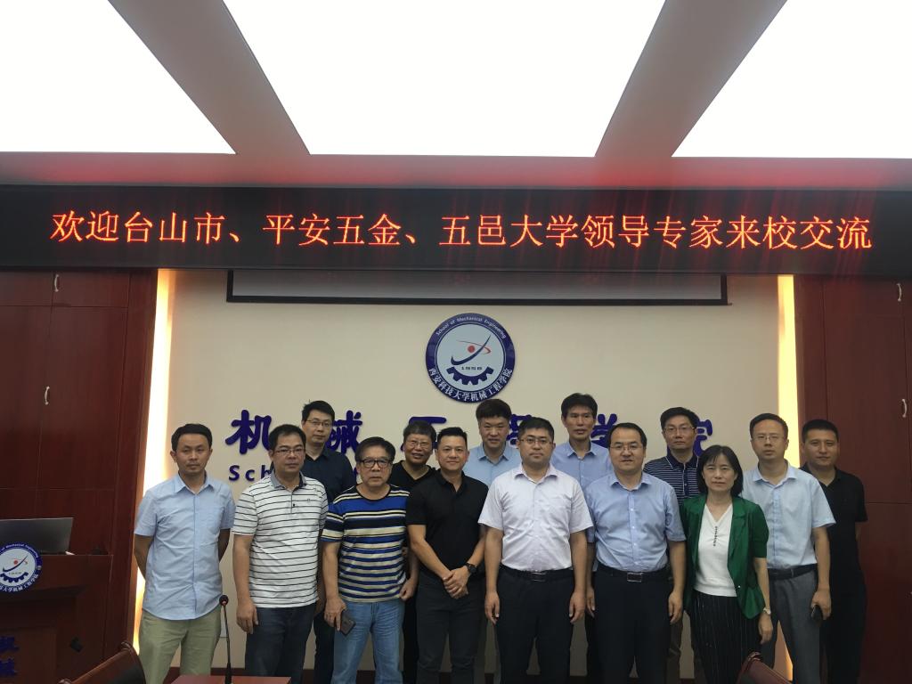8月27日上午,广东台山、江门市部门领导专家一行来校交流,交流座谈会在雁塔校区机械学院学术报告厅举行,台山市人力资源保障局专业技术人员管理股苏惠武股长、综合股科员李星元、五邑大学智能制造学部王大承教授、平安五金制品有限公司总经理蔡志伟、总经理助理徐晓勤,机械工程学党委书记张金来、理学院院长李明、jdb电子游戏官方网站副院长寇发荣,以及学院骨干教师薛河教授、龚晓燕教授、赵宽博士等参会。会议由副院长寇发荣主持。