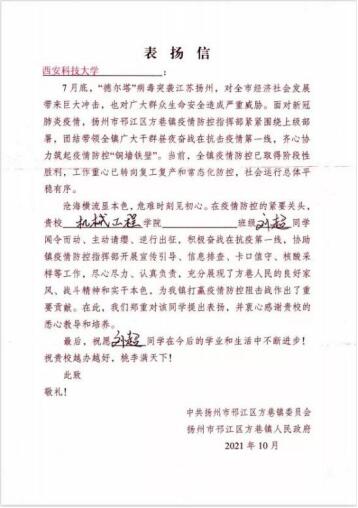 2021月7月底,“德尔塔”病毒突袭江苏扬州,对广大群众生命安全造成严重威胁。jdb电子游戏官方网站机械学院机械电子工程2021级学生刘超不畏艰险,勇于担当,在经过疫苗注射和核酸检测后加入了首批抗疫志愿者队伍,并担任组长,积极奋战在抗疫第一线,协助医疗人员进行全市核酸检测工作,与交警维持卡口交通管制等,与其他志愿者齐心协力共同筑起疫情防控“铜墙铁壁”,为当地疫情防控做出贡献,受到******************扬州邗江区方巷镇委员会的高度评价与肯定。