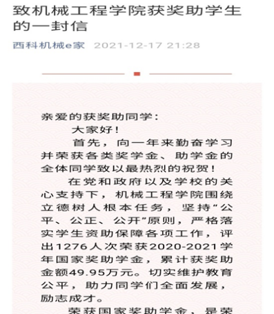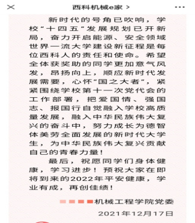 凝心聚力,科学谋划做好教育引导。一是构建“新媒体+传统媒体、学校+二级学院、教师队伍+学生组织”的宣传矩阵,通过网站、微信、微博、短视频、QQ等实行全域化开展思想教育和价值引领,传播正能量,引导学生身体力行弘扬伟大抗疫精神。二是学院发布《jdb电子游戏官方网站党委致各党支部、全体党员倡议书》《jdb电子游戏官方网站致家长的一封信》《机械学院致获奖助学生的一封信》《加强传染病防控促进学生健康成长温馨提示》倡议和号召,教育引导学生坚定信心,珍惜关爱,自觉践行社会主义核心价值观,自觉涵养“团结、勤奋、求实、创新”的校风,心怀“国之大者”,争做全面发展的新时代大学生。三是开通就业考研心理咨询绿色通道,以线上咨询线下辅导的方式为研究生升学考试学生进行心理辅导,帮助学生缓解压力。