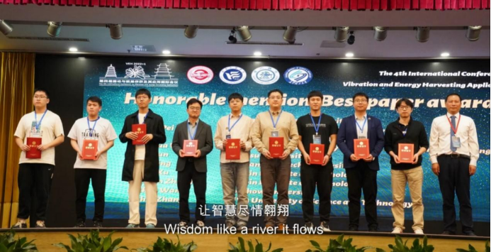 2023年4月14日至16日,第四届振动与能量俘获及其应用国际会议(The 4th International Conference on Vibration and Energy Harvesting Applications,简称VEH2022+1)在湘潭市成功举办,jdb电子游戏官方网站机械电子工程团队青年教师郭岩博士、潘家楠博士撰写论文“Dynamic characteristics of wake galloping energy harvester in coal mine”获得最佳论文提名奖。论文提出了一种应用于弱风速环境下基于弛振的非线性风能能量收集装置,收集的能量可以实现煤矿井下无线传感器的自供能,是解决当前井下传感器布线难题的有效途径。潘家楠博士带领团队研究生参加了会议并作特邀报告。