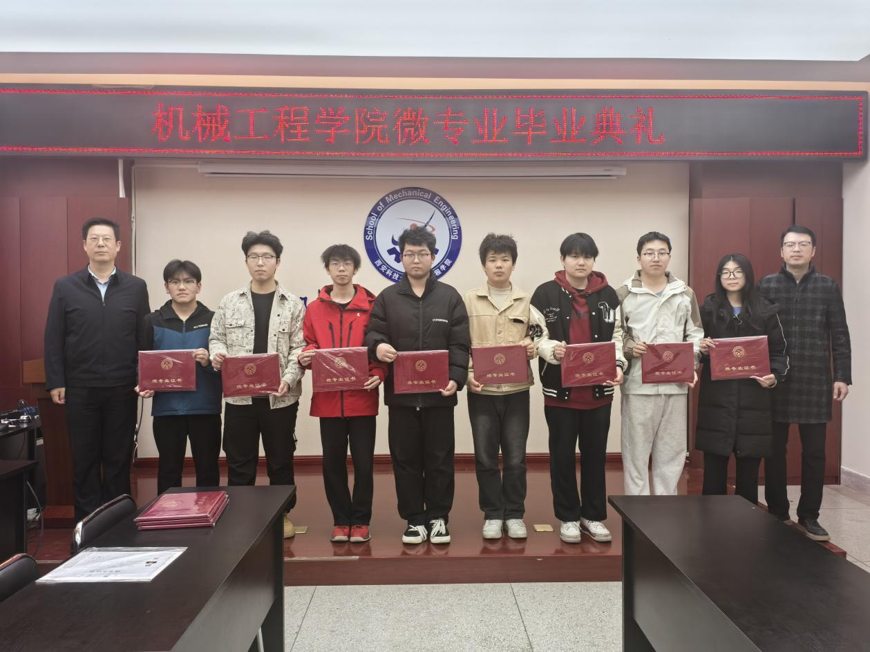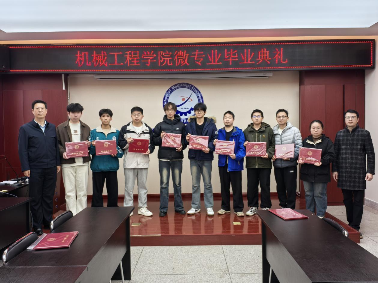 活动中,钟斌详细介绍了本年度开设的新能源汽车工程、智能车辆设计、智能化设计与制造、智能机电工程四个微专业的基本情况以及学生参与本次微专业学习的情况,本年度学院累计75人参加微专业学习,其中75顺利结业,结业率100。并阐释了微专业紧密对接国家战略新兴产业发展需求,旨在打破学科壁垒,融合机械、电子、控制和信息等多学科知识,形成了“模块化、项目化、交叉化”的人才培养特色,提升了学生的跨学科知识整合能力与工程实践创新能力,助力在校大学生未来多一种可能!随后,与会领导和微专业负责人共同为圆满完成学业的同学们颁发了结业证书。