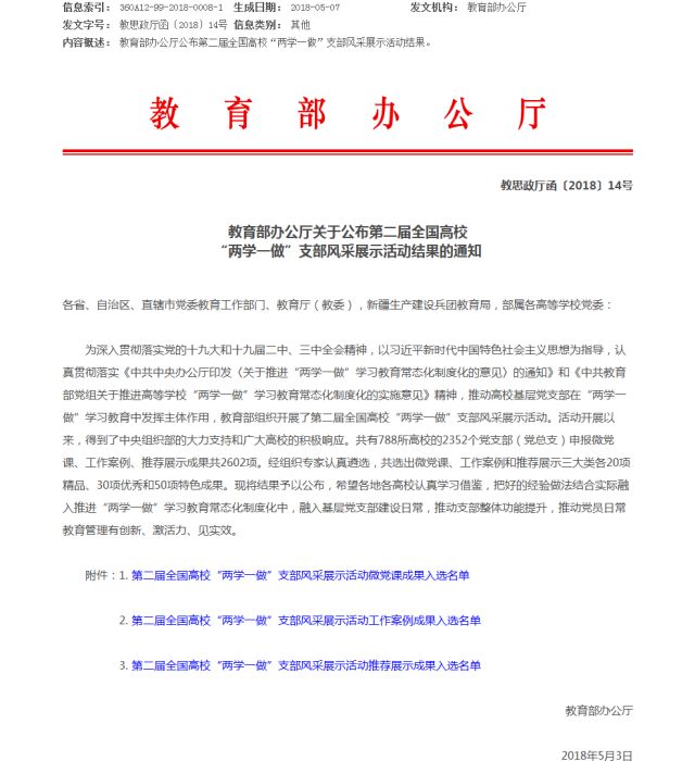 据了解,教育部组织开展的第二届全国高校“两学一做”支部风采展示活动,共收到788所高校的2352个党支部(党总支)的微党课、工作案例、推荐展示成果2602项,经专家认真遴选,共选出微党课、工作案例、推荐展示三大类各20项精品、30项优秀和50项特色成果。