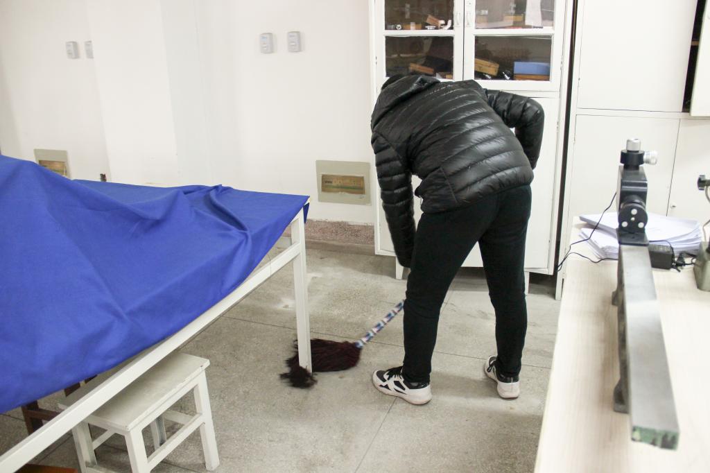 在一个多小时的劳动中,同学们积极清理垃圾,不怕脏,不喊累,相互配合。用扫把、拖把仔细清扫了地上的纸屑灰尘,并用抹布对实验室中的各个机械设备进行清洗,看起来如全新一般。