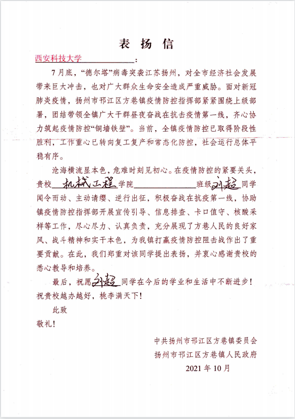2021月7月底,“德尔塔”病毒突袭江苏扬州,对广大群众生命安全造成严重威胁。jdb电子游戏官方网站机械学院机械电子工程2021级学生刘超不畏艰险,勇于担当,在经过疫苗注射和核酸检测后加入了首批抗疫志愿者队伍,并担任组长,积极奋战在抗疫第一线,协助医疗人员进行全市核酸检测工作,与交警维持卡口交通管制等,与其他志愿者齐心协力共同筑起疫情防控“铜墙铁壁”,为当地疫情防控做出贡献,受到中共扬州邗江区方巷镇委员会的高度评价与肯定。